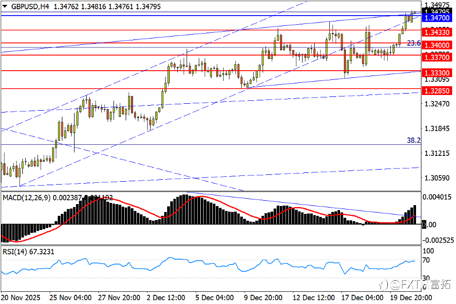 日线图看,早间发布的日本央行会议摘要暗示仍有加息空间,镑/日之前拉升续创2008年高点后,在假日氛围中放慢上攻脚步,近日两次冲击211.60一线未果。然而汇价仍处在11月起新一轮升势通道内,未见明显的涨势力竭征兆。如果多方蓄势后再攻破前者,后续上行目标或指向2008年2月、6月密集高点213.70,以及当年下半年高点215.90。指标方面,MACD在零轴上方高位金叉后缓涨;RSI于超买线附近窄幅波动,整体表现依旧偏强。