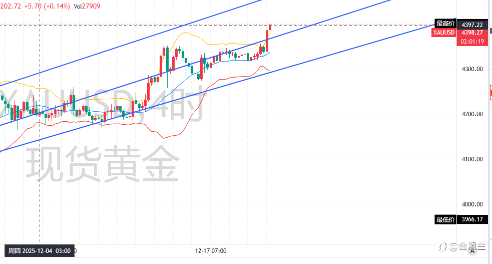 昨日现货黄金上演“高台跳水”,单日暴跌200点、跌幅达4.49%,日内冲高至4549.63美元后直线下挫,最低触及4303.11美元,最终收于4328.53美元。1小时K线呈近乎垂直下跌曲线,布林带下轨直接击穿,MACD绿柱急剧放大,空头动能释放至峰值。