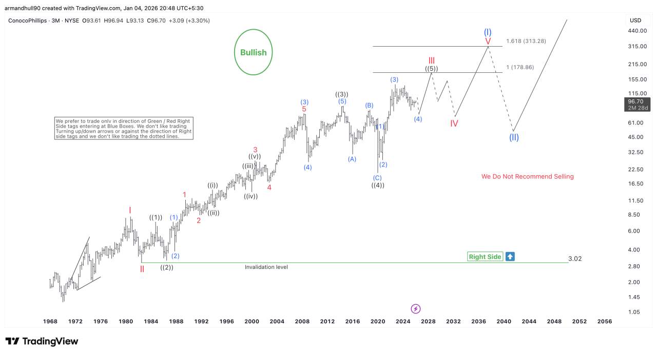 The “We Do Not Recommend Selling” note on the chart reinforces the directional bias. With the Right Side tag firmly pointing higher, trading in the direction of the bullish trend remains the preferred approach. Historically, COP has rewarded investors who stayed aligned with the impulsive structure rather than reacting to temporary corrections.