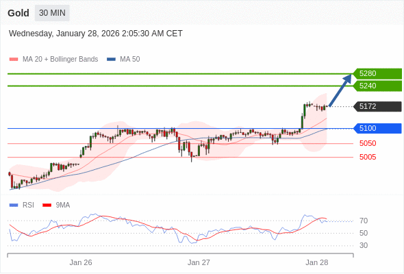 KVB-黄欧Owen 14 Jan 2026, 11:59 · 阅读量 650 关注 交易策略在 4575 之上,看涨,目标价位为 4650 ,然后为 4675 。备选策略在 4575 下,看空,目标价位定在 4550 ,然后为 4530。技术点评RSI技术指标向上运行。 风险提示:本文所述仅代表作者个人观点,不代表 Followme 的官方立场。Followme 不对内容的准确性、完整性或可靠性作出任何保证,对于基于该内容所采取的任何行为,不承担任何责任,除非另有书面明确说明。 赞赏作者 喜欢的话,赞赏支持一下