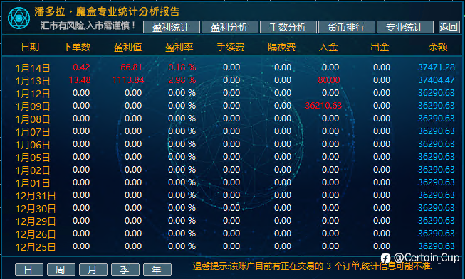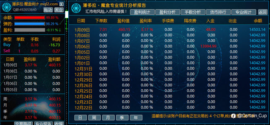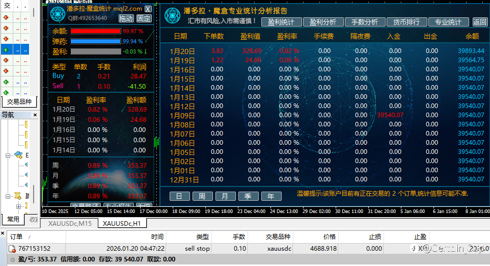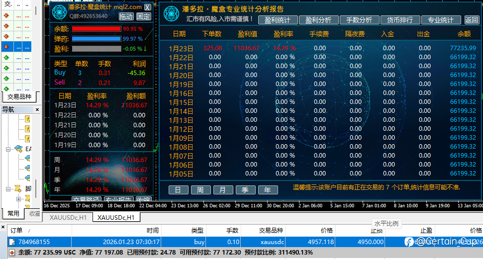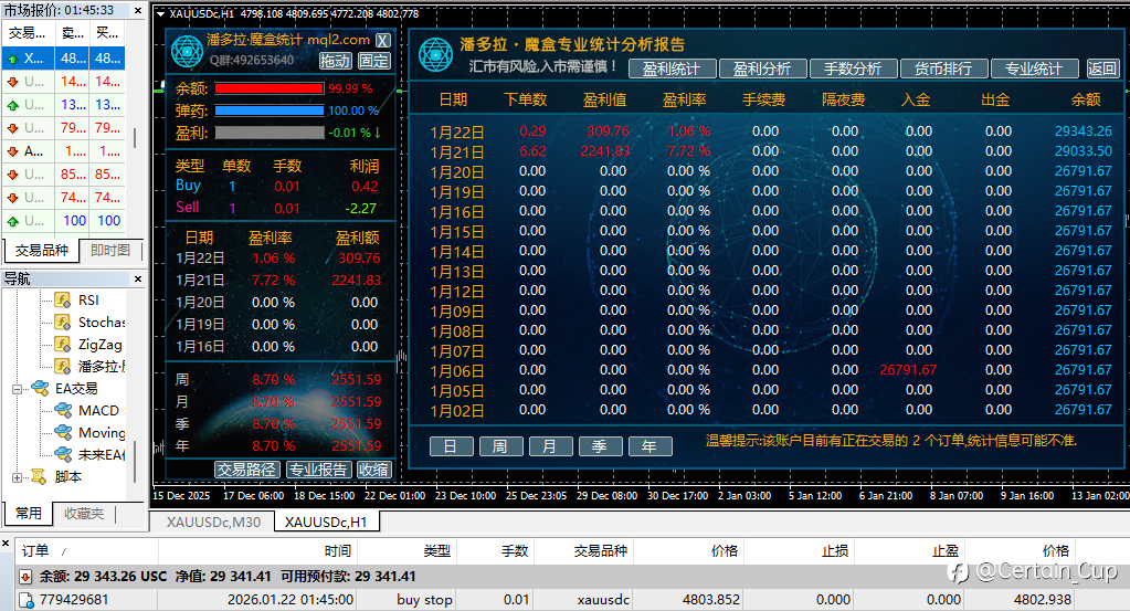 Certain_Cup 17 Jan 2026, 08:20 · 阅读量 261 关注 1月16日收益截图账户1:收益2448,占比5.4%,手动账户2:收益240,占比0.62%,EA成果。今日黄金波幅增大,大家都注意风险。 风险提示:本文所述仅代表作者个人观点,不代表 Followme 的官方立场。Followme 不对内容的准确性、完整性或可靠性作出任何保证,对于基于该内容所采取的任何行为,不承担任何责任,除非另有书面明确说明。 赞赏作者 喜欢的话,赞赏支持一下