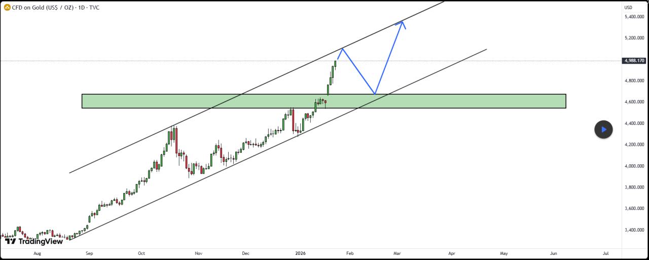 Emas telah mengalami reli yang cepat dan impulsif selama beberapa minggu terakhir, mencapai level psikologis $ 5.000. Sementara langkah ini menyoroti momentum bullish yang kuat, membeli pada level ini membawa risiko yang meningkat.