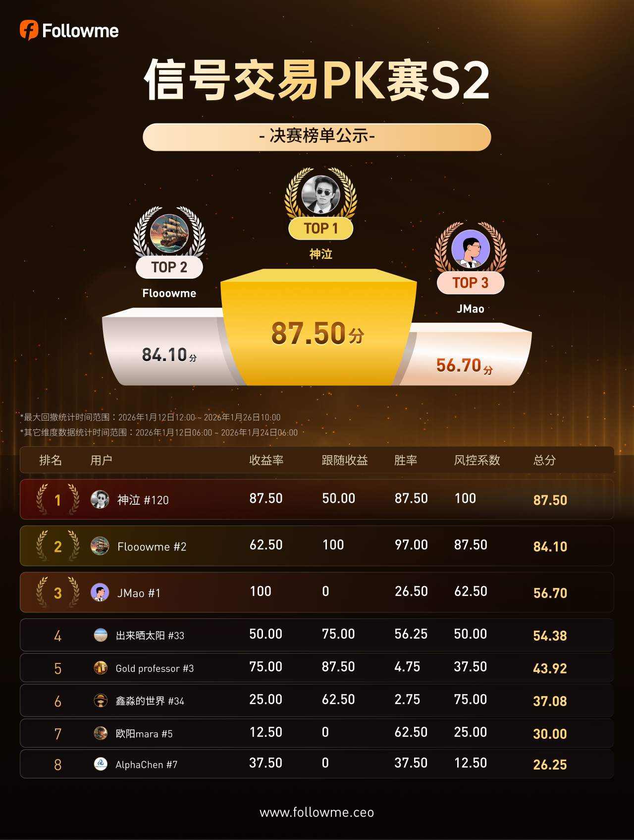 @Flooowme 虽未能守住榜首,但在最终阶段也继续扩大优势。其总分由 73.15 分提升至 84.1 分,胜率得分从 48 提升至 97,跟随收益保持满分,最终稳居榜单前2,成为本次比赛中综合表现最稳定的账户之一。