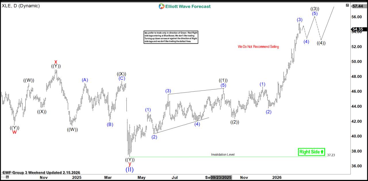 From the March 2020 low, $XLE appeared to complete a 5-wave impulsive cycle, followed by a double zigzag (WXY) correction into Apr 2025 low. Another 5-wave impulsive cycle took place, followed by a correction into Oct 2025 low at black ((2)). With that corrective and cyclical sequence seemingly finished, our focus shifted to the next bullish phase.