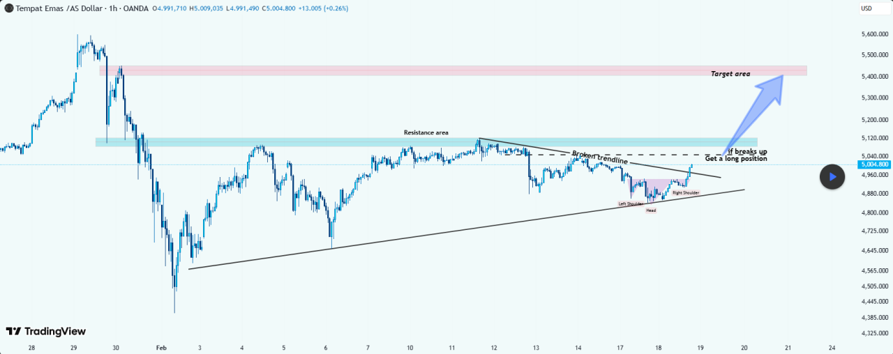 Jika harga menembus dan bertahan di atas area ini, itu akan mengkonfirmasi kekuatan dan membuka jalur untuk kelanjutan menuju zona target merah muda di dekat 5.380 – 5.450.