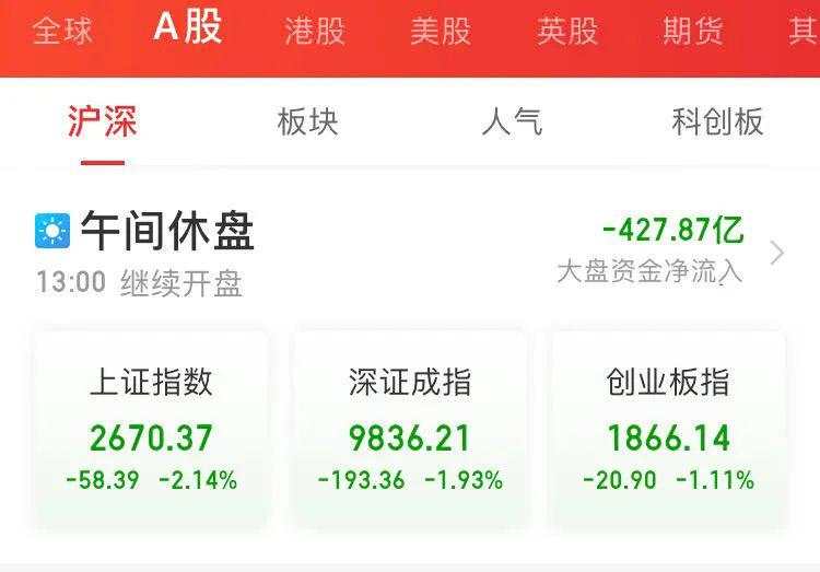 A股方面。A股三大指数开盘短暂走强后快速下挫。截至午间收盘,沪指跌2.14%,报2670.37点;深成指跌1.93%,报9836.21点;创业板指跌1.11%,报1866.14点;两市成交额约5000亿元;值得关注的是,北向资金净流出规模近50亿元。