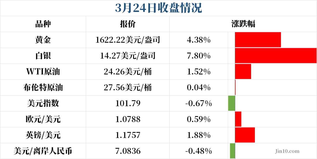 周四(4月9日)欧市盘中,欧元/美元反弹,日内最高触及1.0889;英镑/美元同样上涨,最高1.2442;美元指数回到100下方,最低99.90;现货黄金大涨超1%,最高1664美元/盎司。