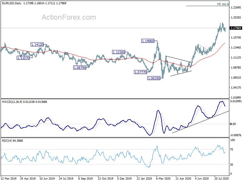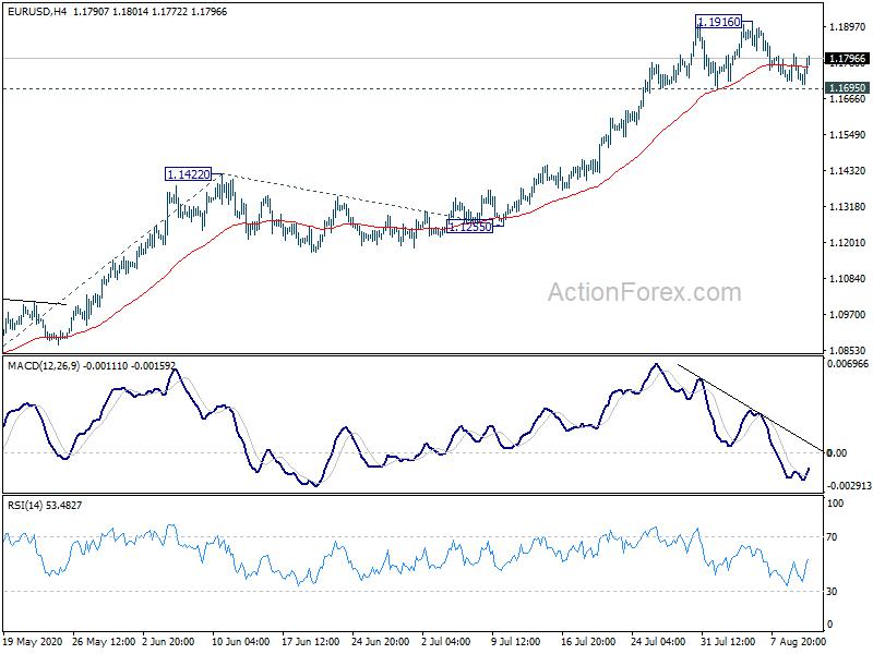 Intraday bias in EUR/USD stays neutral and outlook is unchanged. As long as 1.1695 support holds, further rise could still be seen. On the upside, break of 1.1916 will target will extend larger rally from 1.0635 to 161.8% projection of 1.0774 to 1.1422 from 1.1255 at 1.2303. However, firm break of 1.1695 should confirm short term topping. Intraday bias will be turned back to the downside to wards 1.1422 resistance turned support.