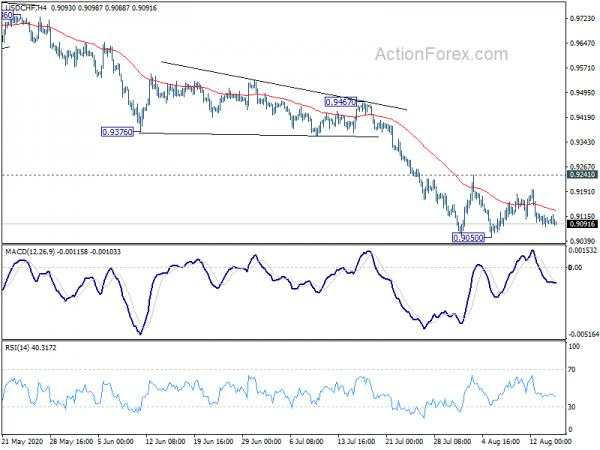 USD/CHF stayed in consolidation above 0.9050 last week and outlook is unchanged. Initial bias stays neutral this week first. With 0.9241 resistance intact, further decline is expected. On the downside, break of 0.9050 will resume larger down trend. Nevertheless, on the upside, break of 0.9241 resistance will confirm short term bottoming and turn bias to the upside for 0.9376 support turned resistance.