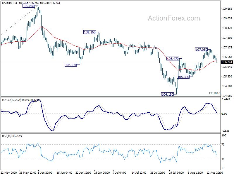 USD/JPY’s retreat from 107.05 extends lower today but stays above 105.30 support. Intraday bias remains neutral first and further rally is in favor. We’d holding on to the bullish case. That is, corrective fall from 111.71 has completed with three waves down to 104.18, after missing 100% projection of 111.71 to 105.98 from 109.85 at 104.12. On the upside, above 107.05 will target 108.16 resistance next. However, break of 105.30 support will turn bias back to the downside for 104.18 low instead.