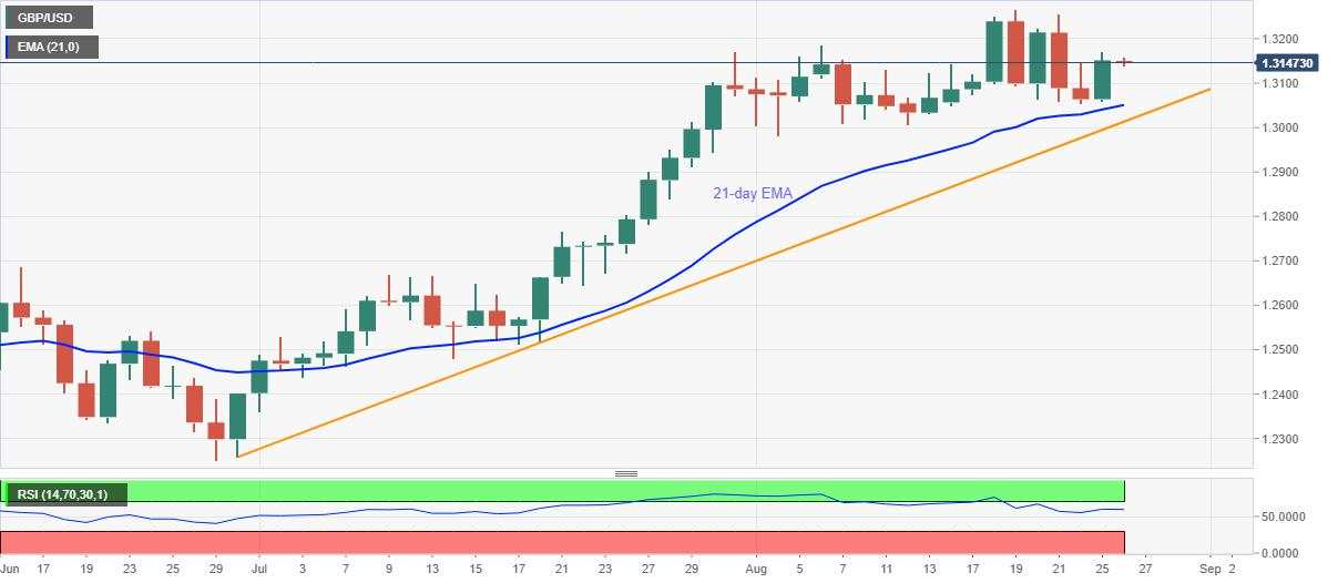 GBP/USD struggles to keep the previous day’s upside momentum while easing to 1.3145 during early Wednesday. The Cable bounced off 21-day EMA on Tuesday but couldn’t cross 1.3200 mark comprising March month top.