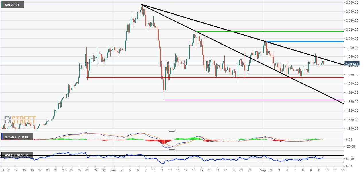The 4-hour chart gives us the best idea about what to expect and look out for next week. The key feature on the chart is the black downward sloping trendline. If the price breaks the level it could increase the likelihood that the recent all-time high could be tested. Beyond this, the blue resistance line at USD 1992.42 per troy ounce is also important. If it breaks then it would create a new wave high which has not been done since the beginning of August. It seems the price has bounced off the aforementioned trendline today (Friday) and this could have bearish implications. On the downside, the next resistance lies at the red line (USD 1914 per troy ounce). If there is a break of the red horizontal line then the bulls could be in trouble and the consolidation low of USD 1863.24 per ounce could be under threat. As this is a long term uptrend the levels on the upside are in focus and the first point of call would be the trendline break.