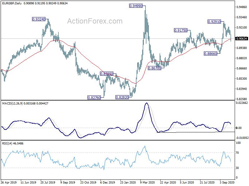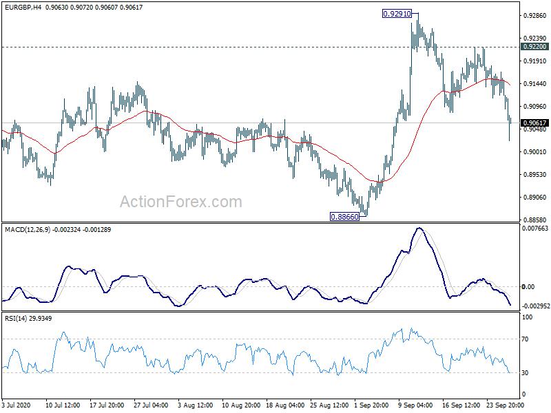 EUR/GBP drops sharply to as low as 0.9024 so far today. The break of 0.9067 support, as well as 55 day EMA, raises the chance that rebound from 0.8670 has completed. Intraday bias is turned back to the downside for 0.8866 support for confirmation. For now, risk will remain mildly on the downside as long as 0.9220 resistance holds, in case of recovery.