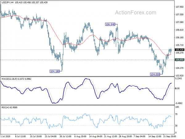 USD/JPY is staying in range below 105.80 and intraday bias remains neutral first. On the upside, break of 105.80 will resume the rebound from 104.00 to 106.94 resistance next. on the downside, break of 104.92 will suggest completion of rebound from 104.00. Intraday bias will be turned back to the downside for retesting this low.
