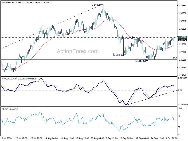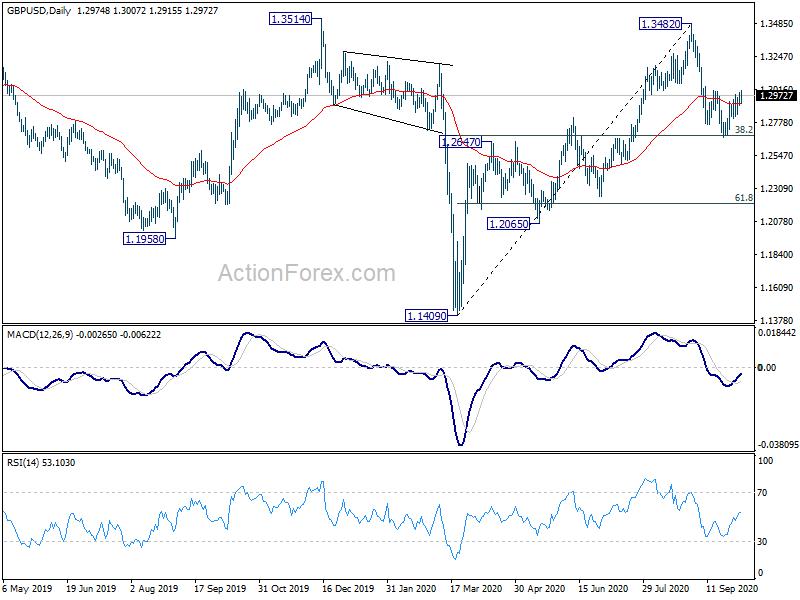 GBP/USD failed to break through 1.3007 resistance and retreated notably today. Though, it’s staying in range of 1.2675/3007 and intraday bias remains neutral. On the upside, firm break of 1.3007 resistance will suggest that decline from 1.3482 is merely a corrective move and has completed. Intraday bias will be turned back to the upside for retesting 1.3482. On the downside, sustained break of 38.2% retracement of 1.1409 to 1.3482 at 1.2690 will argue that the rise from 1.1409 might be completed, and bring deeper fall to 61.8% retracement at 1.2201.
