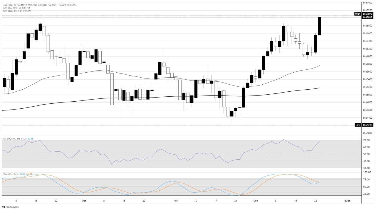 AUD/USD đã giảm khi mở đầu tuần giao dịch cuối cùng của năm 2025, dừng lại đợt tăng giá gần đây và lùi xuống dưới mức 0,6700 khi các nhà giao dịch quay trở lại vị thế phòng thủ trong bối cảnh giảm tốc cuối năm.