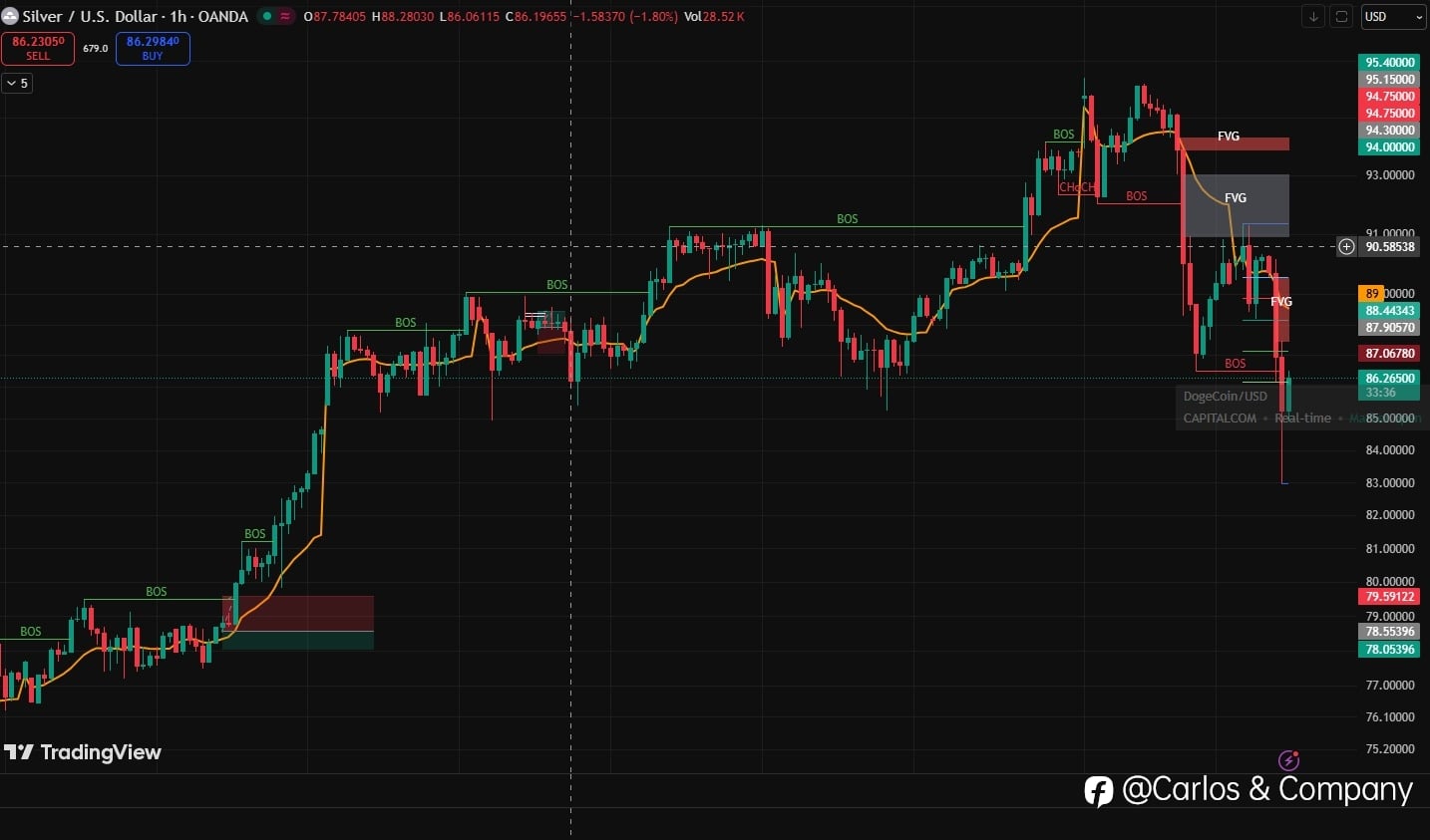 Silver is currently trading near 82.60 after a strong rejection from the 94.00–95.00 supply zone, which triggered a Change of Character (ChoCH) followed by bearish continuation. This shift indicates that the previous bullish momentum has weakened and sellers are currently controlling the market stru