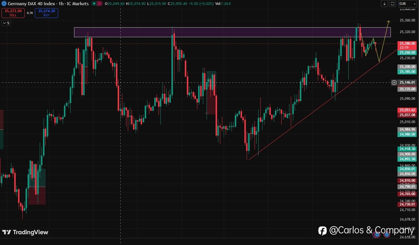 DAX continues to respect bullish structure with higher highs & higher lows. Price is consolidating just below 25,320–25,350 supply, indicating breakout potential. Key Levels: Support: 25,200 → 25,135 → 25,050 Resistance: 25,320 → 25,360 → 25,450 📈 Break & hold above 25,320 → bullish continu