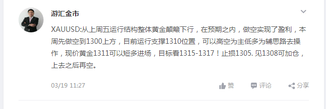 黄金空单现价1333,空头趋势很强,现在可以减仓,反弹上去继续空!晚间借助数据GDP利空快速下探至1332.5附近 风险提示:本文所述仅代表作者个人观点,不代表 Followme 的官方立场。Followme 不对内容的准确性、完整性或可靠性作出任何保证,对于基于该内容所采取的任何行为,不承担任何责任,除非另有书面明确说明。