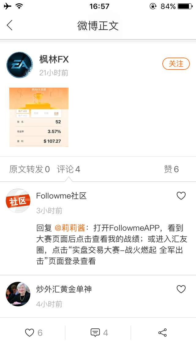 尊敬的交易员,邀你晒一晒《我是交易员》实盘交易大赛S2赛季#我的交易大赛战绩# ——【参与方式:打开https://m.followme.com/jyds/in...~~ 点击登录~~查看我的交易战绩~~分享到汇友圈】 这个参与姿势你get对了吗?