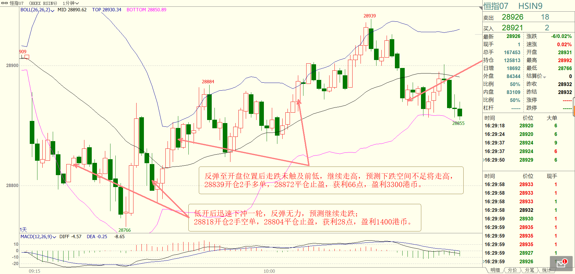 一、回顾行情:指早间跳空高开420点,开盘上冲一轮后快速回跌下探28800后上证翻红快速反弹,连续的多头阳线上涨至今日高点29054后高位横盘后,回跌至开盘线后反弹再次冲高二次突破29000压力区间,多头力量减缓承压回跌,尾盘回跌减缓波动区间,受多头驱使在尾盘第三次缓慢走涨三次触顶承压回跌至收盘,下午开盘恒指走缓慢阴跌,窄幅震荡至收盘。