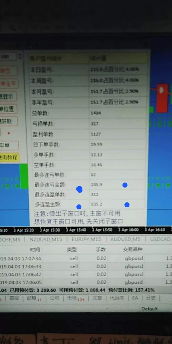 2019.4.3:做单总结:交易实盘软件MT4,艾拓思平台。操作资金4600左右,白天操作亏损290左右,晚上用开单软件测试实盘,趋势震荡行情,看分时图做单,拐点下单,每次下单剩百分之三百的仓位滚刀肉,4号早上四点收工,错过最后一波没有开单。总体收益5880-4600=1280是过年以来收益最好的一天。软件测试不错,就是少了2个功能,多单空单盈利平仓功能没有。分时,三分钟,一分钟为开仓信号,仓位开到剩百分之三百。最多5美一单,最少0.08美一单,方向改了就全平。收益很满意。每次开单平均0.02手为一单,连续开到剩余百分之300的仓为止。不过脑,方向改了就全平不留单。不知道我是不是第一个这样做单的人。有时间可以一起聊聊交易经验。