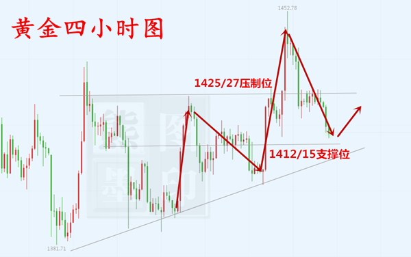 黄金从4小时来看,黄金暂时呈现相当窄幅的交投,整体黄金维持在1430-1414区间内震荡运行,由于长时间的震荡,均线方面处于纠结状态未有任何参考作用MACD红色动能柱显现后不变,且实体较窄,KDJ随机指标略偏向下,但有形成死叉的可能性出现,暗示黄金短线上涨动能不足,或展开一定程度的回撤。在1430-1414区间突破前,继续看待黄金持续改区间内的震荡。综合来看,今日操作思路上墨图个人建议采取区间回调做多即可,上方重点关注1430-1435一线阻力,下方短期关注1408-1410一线支撑。