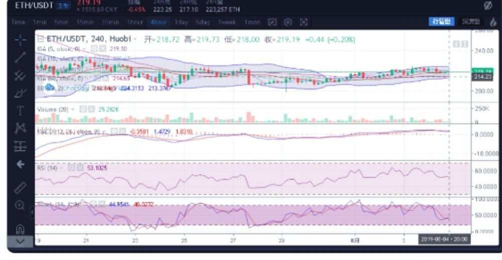 BTC日线图上,走势上行穿过布林带中轨,成功站在了布林带中上轨区间,上攻之势昭然若揭,5日均线上行穿过10日均线形成金叉,底部支撑已经形成规模,昨日收得十字星,可以说昨日是空方反扑的一天,但是并未去的有效的战果,反而被乘机消耗站稳到9900区域,也就迎来了目前的放量上涨;指标MACD在0轴下方快慢线相交粘合,有形成金叉之势,指标STOCH与RSI均向上运行,整体走势已然形成上行趋势,但布林带呈收口的姿态,走势也会偏向于震荡调整。