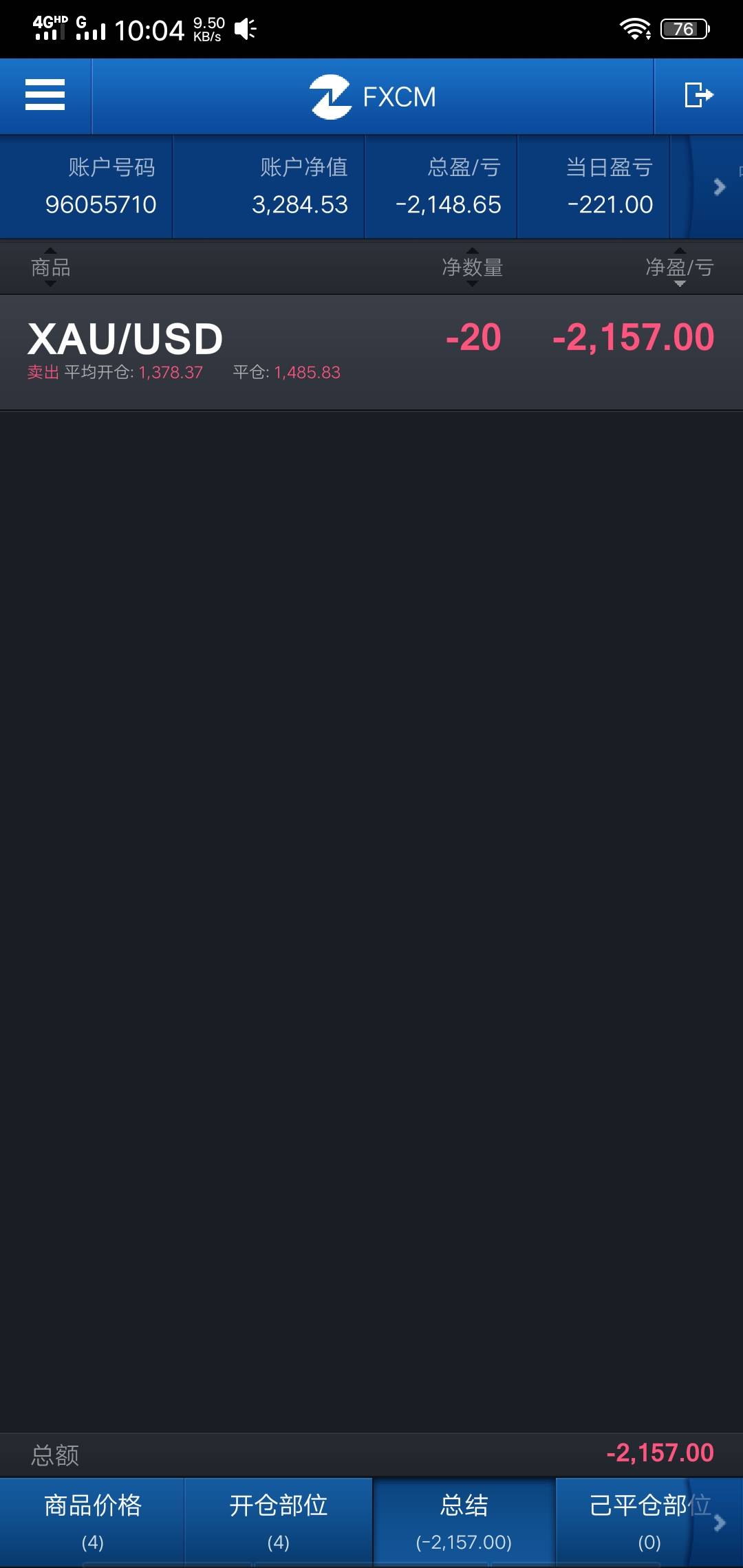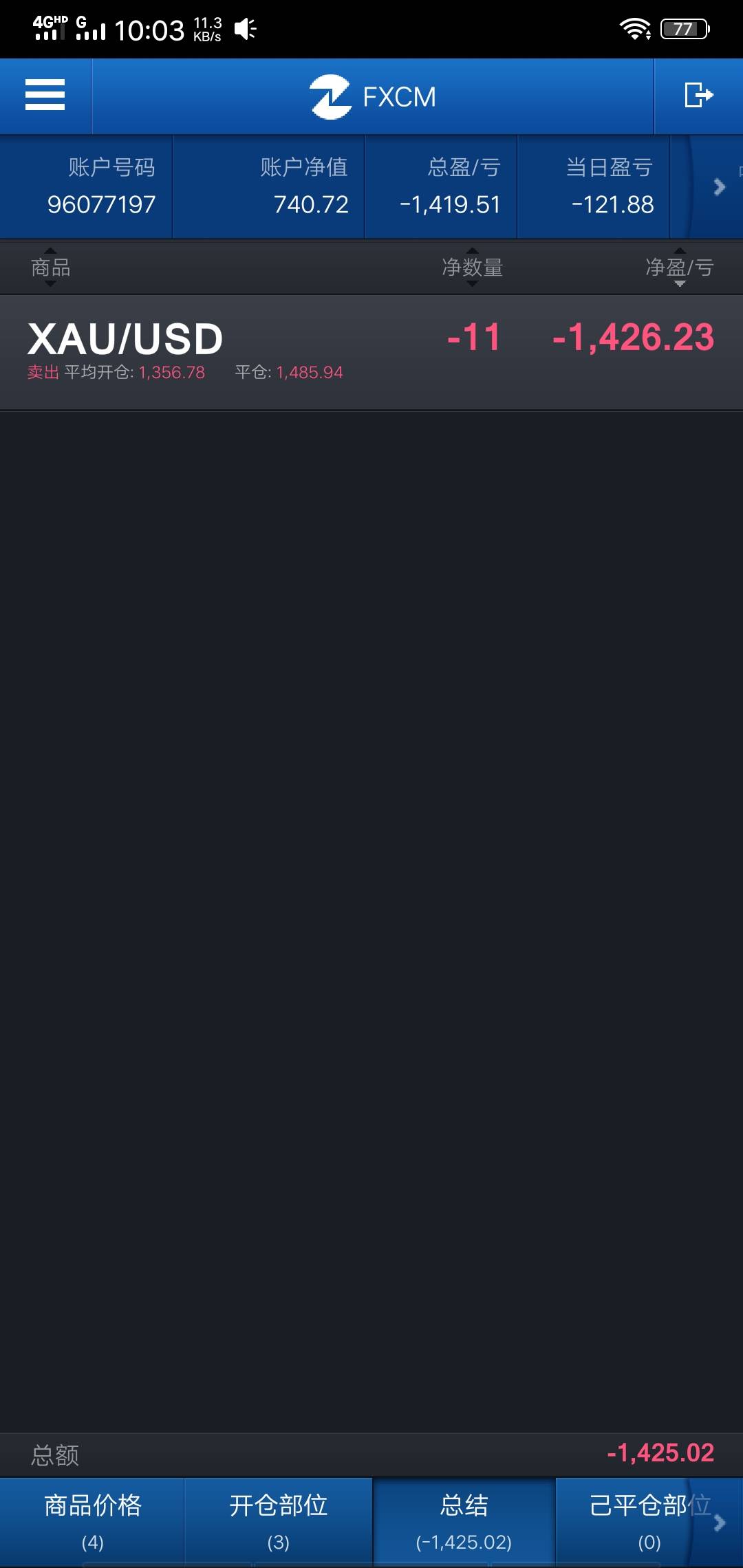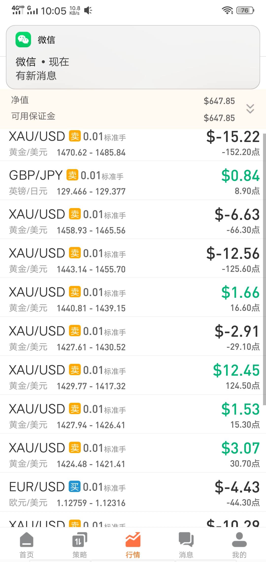 连损三单,这星期是不想操作了。最近两个月的黄金交易很差,得找个机会出仓调整了,虽然亏的不算多,但对自信和心态打击还是很大,很多时候觉得自己是傻冒。交易确实是很难!反人性 ,可是魅力就是无限呀,没办法,入坑三年,亏损,20w加,对别的行业没兴趣了!能不能出坑不知道,在followme写微博记录一下交易历程,希望多年以后followme还在,我还在交易。其实每周日的交易计划还是不错的,就是真正的执行很难。下周开始再次减少交易品种,看能不能提高执行力。止损的followme帐户成了损失最小的了,回撤百分之十五左右,另两个还没出坑,2000美金的帐户爆仓概率极大,现在也不知道怎么操作,只有看着了。损心有不甘,拿可能爆仓。跟随者谨慎跟随吧!