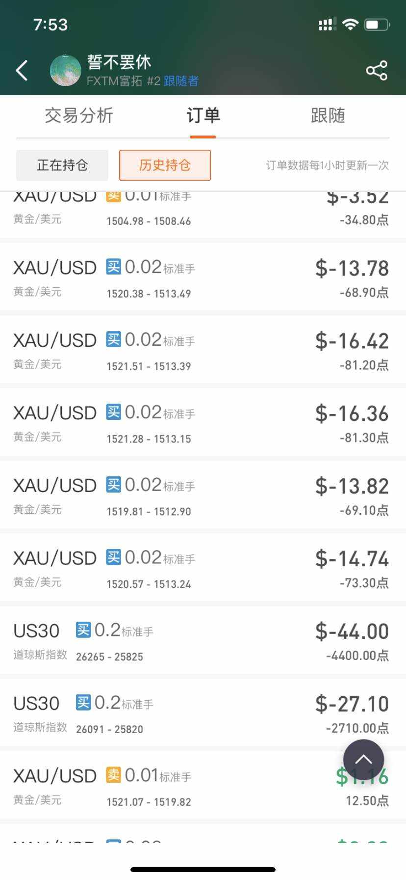 每次爆仓后的第一反应是入金翻本,想理智一点,本想只跟一到两个交易员,从0.01跟起做,慢慢盈利了,就提高比例,然后或者增加交易员,或者又提高跟单比例,然后就某一天跟今天一样,爆了。 风险提示:本文所述仅代表作者个人观点,不代表 Followme 的官方立场。Followme 不对内容的准确性、完整性或可靠性作出任何保证,对于基于该内容所采取的任何行为,不承担任何责任,除非另有书面明确说明。