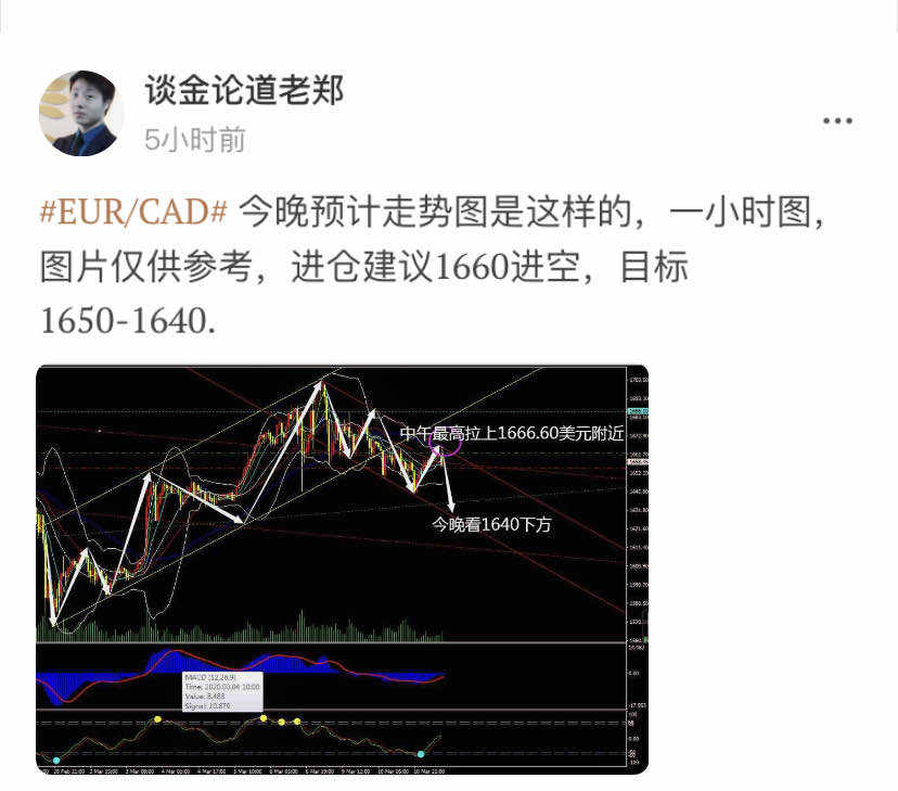 #EUR/CAD# 1680进空,目标1660止损5美金。 风险提示:本文所述仅代表作者个人观点,不代表 Followme 的官方立场。Followme 不对内容的准确性、完整性或可靠性作出任何保证,对于基于该内容所采取的任何行为,不承担任何责任,除非另有书面明确说明。