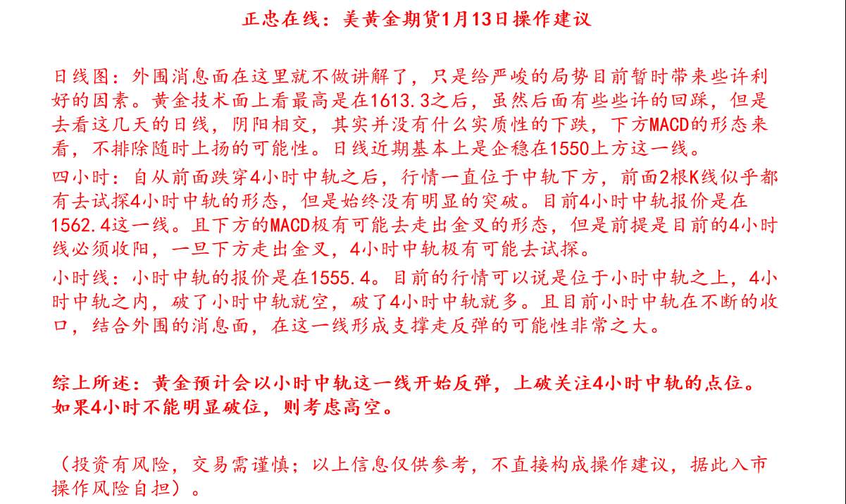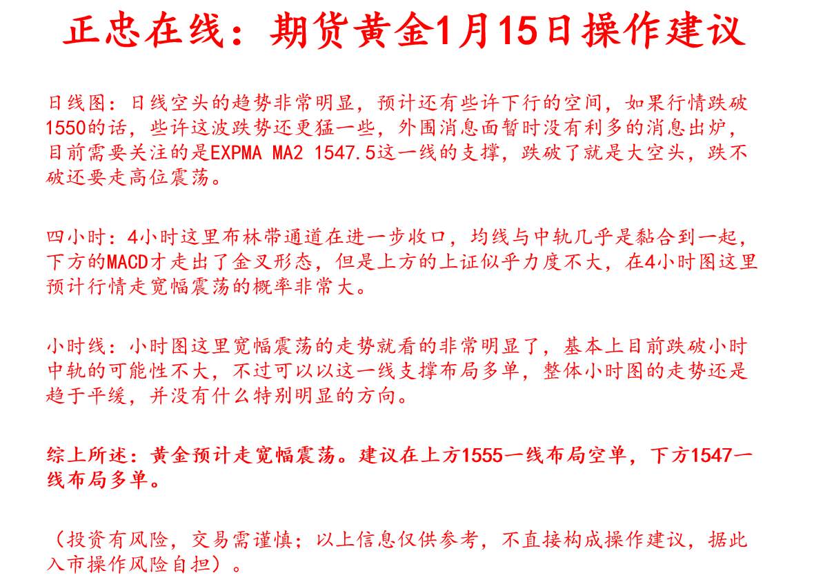#XAU/USD# 正忠在线:期货黄金1月15日操作建议 日线图:日线空头的趋势非常明显,预计还有些许下行的空间,如果行情跌破1550的话,些许这波跌势还更猛一些,外围消息面暂时没有利多的消息出炉,目前需要关注的是EXPMA MA2 1547.5这一线的支撑,跌破了就是大空头,跌不破还要走高位震荡。 四小时:4小时这里布林带通道在进一步收口,均线与中轨几乎是黏合到一起,下方的MACD才走出了金叉形态,但是上方的上证似乎力度不大,在4小时图这里预计行情走宽幅震荡的概率非常大。 小时线:小时图这里宽幅震荡的走势就看的非常明显了,基本上目前跌破小时中轨的可能性不大,不过可以以这一线支撑布局多单,整体小时图的走势还是趋于平缓,并没有什么特别明显的方向。 综上所述:黄金预计走宽幅震荡。建议在上方1555一线布局空单,下方1547一线布局多单。 (投资有风险,交易需谨慎;以上信息仅供参考,不直接构成操作建议,据此入市操作风险自担)。