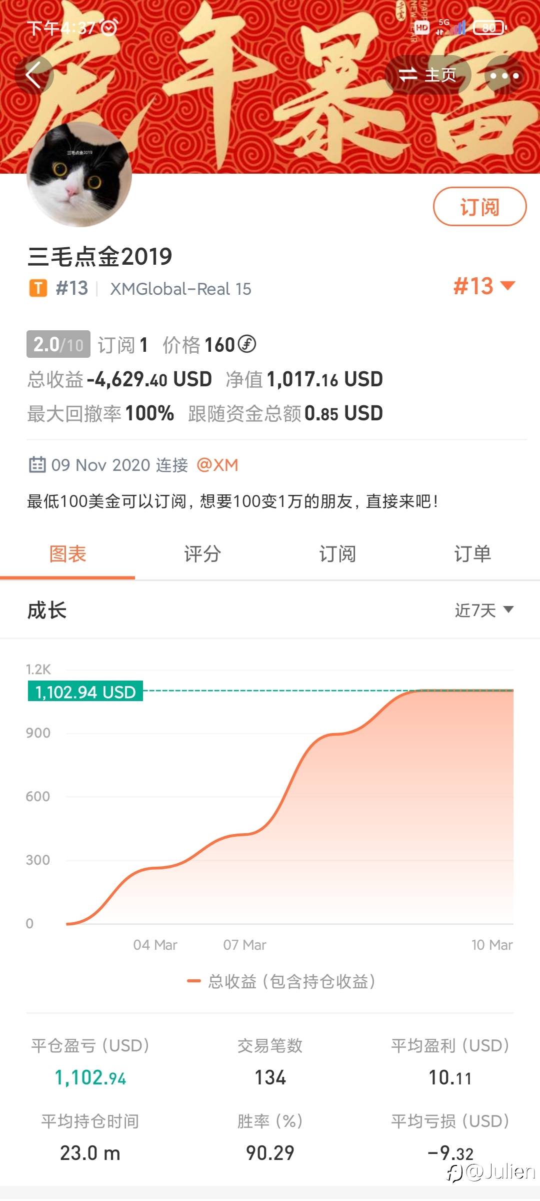 半夜醒来惊闻黄金上了1720,掐指一算三毛同学肯定会抄顶,点开一看果不其然,已经浮亏1000刀左右。我发现很多人有个误区,追求高收益,全然不考虑风险,也不去评估风险回报率,就盲目跟单,假设你制定的风控回撤为5%,那么你的月收益目标3~5%就可以了,年风险回报率可以达到1:8-12,别小瞧这个数据,能达到年1:8的都可以说是凤毛麟角。扯远了,事不过三,前面二次扛过去了,这次三毛悬了!虽然这周因为各种原因自己也操作的不行,但也只亏损了1%,趋势一来,两单就能回来。最后做个调查,如果单笔0.25%的止损,回撤控制在5%之内,月收益3~5%,定价10💲,还有订阅保障,这样的策略你们愿意订阅吗?