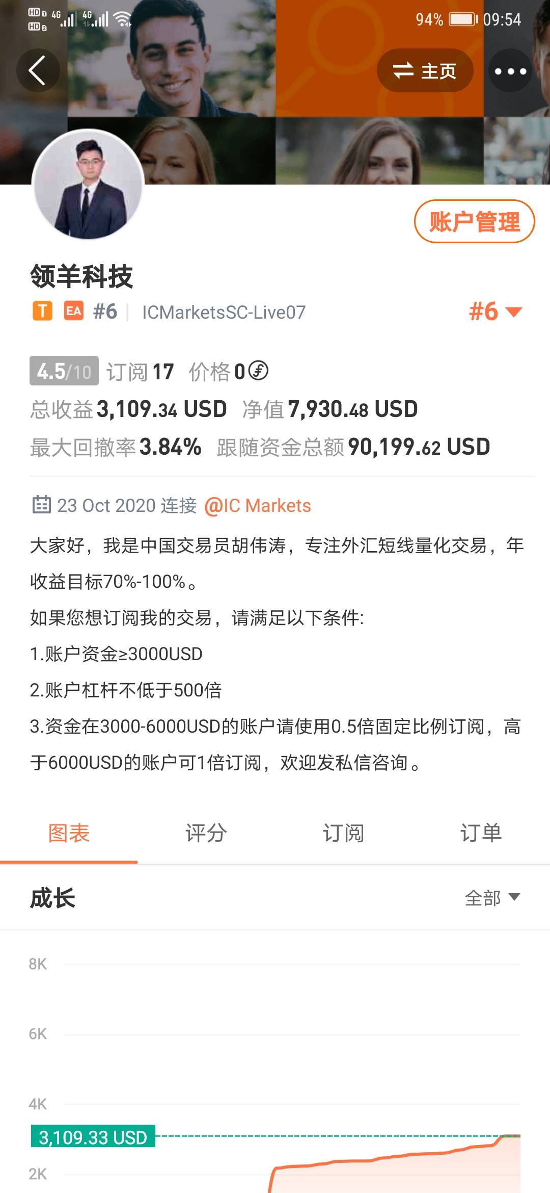经过三年多的编写和调试,由我们领羊科技自主研发的自动交易系统今天正式投放应用啦!欢迎各位关注订阅,未来我们将以优异的交易成绩证明自己的实力。 风险提示:本文所述仅代表作者个人观点,不代表 Followme 的官方立场。Followme 不对内容的准确性、完整性或可靠性作出任何保证,对于基于该内容所采取的任何行为,不承担任何责任,除非另有书面明确说明。