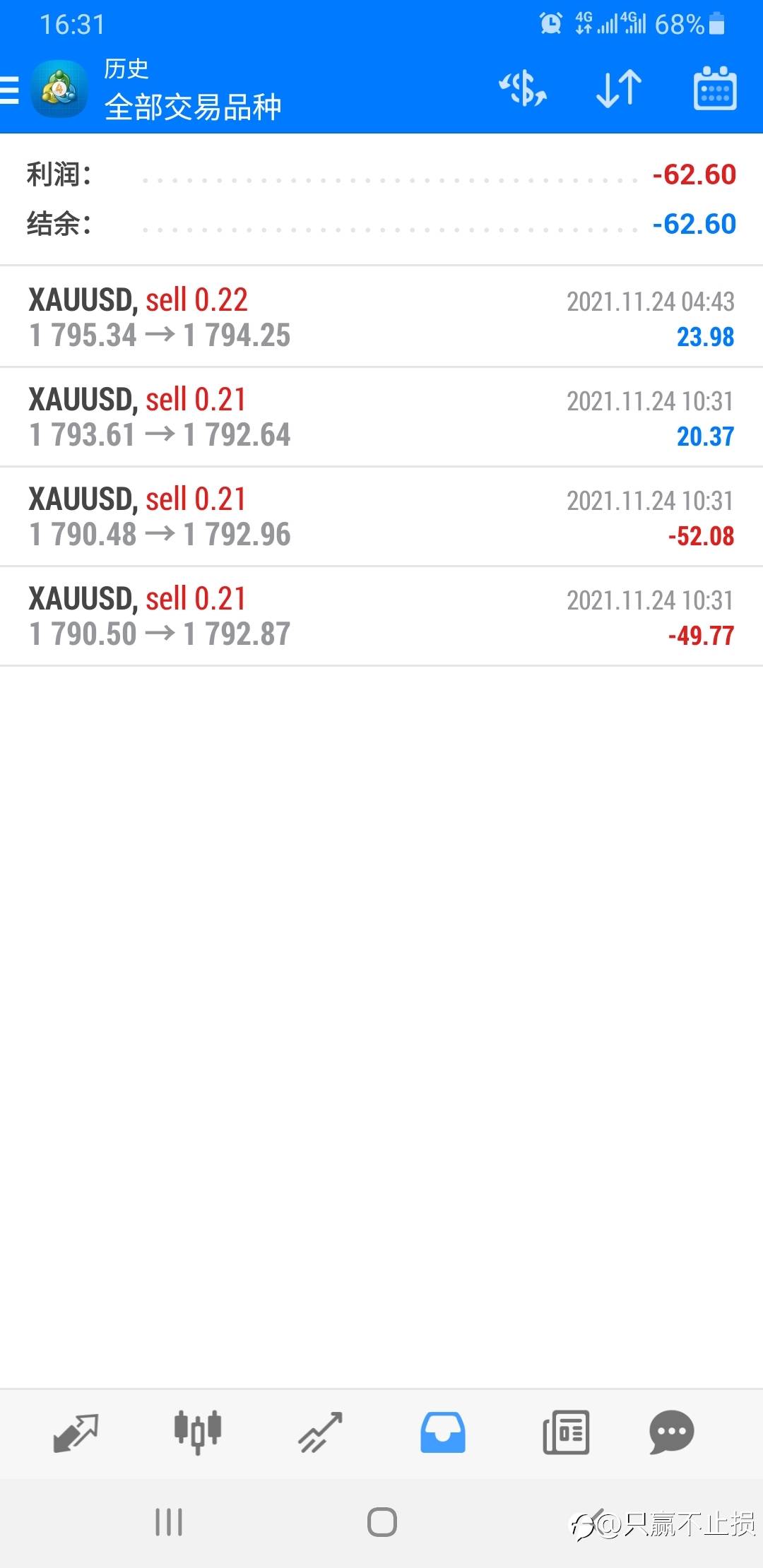 5分钟交易周期,频繁刷单,快进快出的,我想应是平台代理开发的吧,赚返佣吗?晒出来的单子,全部盈利,这外汇里面,哪还来那么多的亏损??难道我接触的,是亏损圈而非外汇圈? 风险提示:本文所述仅代表作者个人观点,不代表 Followme 的官方立场。Followme 不对内容的准确性、完整性或可靠性作出任何保证,对于基于该内容所采取的任何行为,不承担任何责任,除非另有书面明确说明。