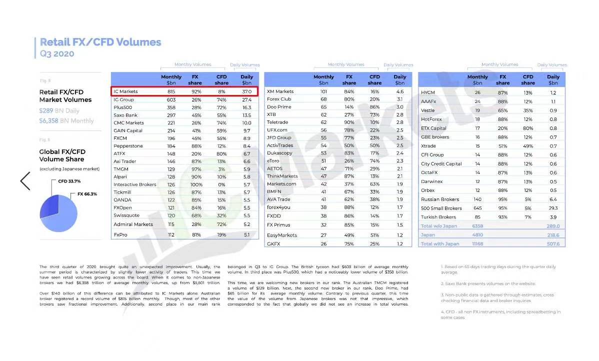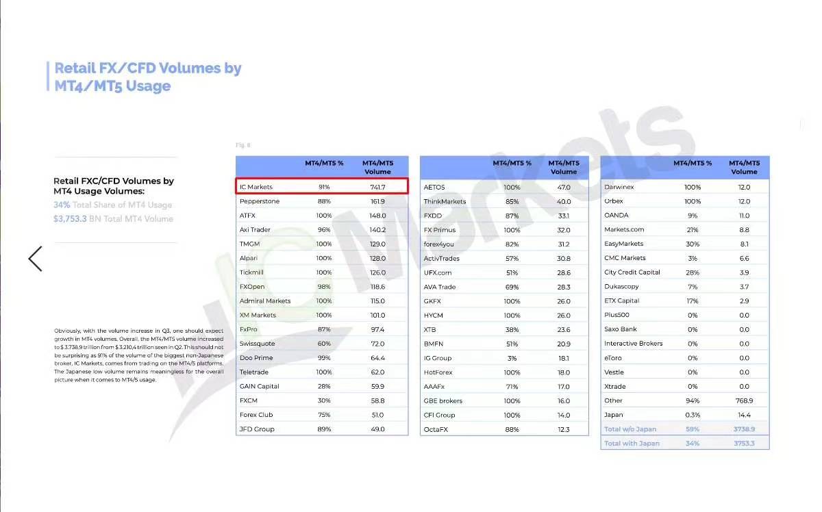 随着第三季度全球交易量的增加,MT4 / MT5交易量从第二季度的3万2104亿美元增至第三季度的3万7533亿美元,IC Markets第三季度MT4交易量达到了惊人的7417亿美元毋庸置疑的仍然以第一名的成绩荣登MT4/MT5经纪商交易量排行榜成为全球最大的MT4/MT5经济商。