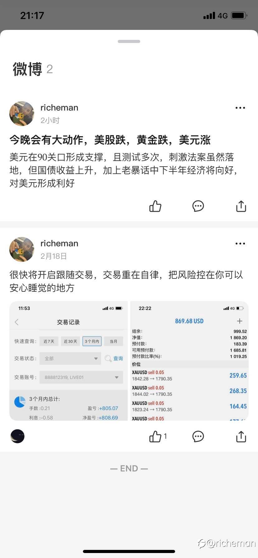 很快将开启跟随交易,交易重在自律,把风险控在你可以安心睡觉的地方 风险提示:本文所述仅代表作者个人观点,不代表 Followme 的官方立场。Followme 不对内容的准确性、完整性或可靠性作出任何保证,对于基于该内容所采取的任何行为,不承担任何责任,除非另有书面明确说明。