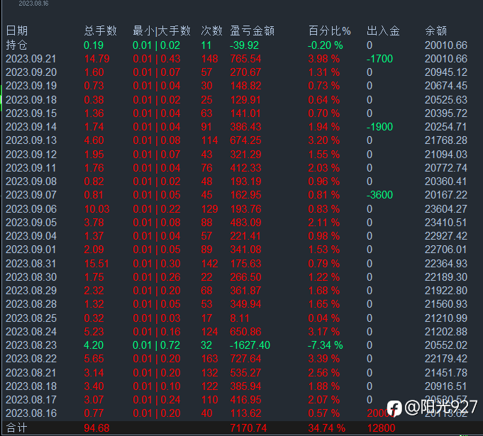 情绪是最大的敌人,什么时间能控制交易时间出现的情绪化交易,那么离成功就不远了,两处资金快速回撤都是情绪交易引起的,后面调整一下。 风险提示:本文所述仅代表作者个人观点,不代表 Followme 的官方立场。Followme 不对内容的准确性、完整性或可靠性作出任何保证,对于基于该内容所采取的任何行为,不承担任何责任,除非另有书面明确说明。