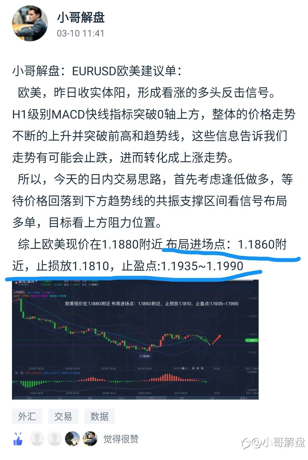 #EUR/USD#欧美即将给到进场点位,准备在1.1860截胡多!严格带好止损,这个共振支撑区跌破多单就GG了!有同思路想法的可以跟上!