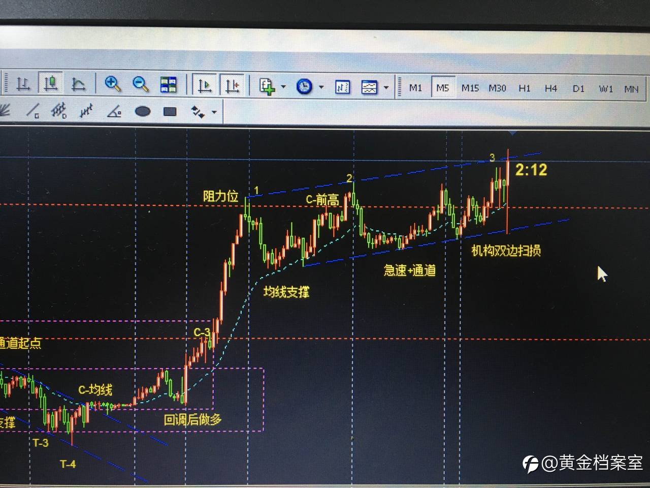 #XAU/USD#M5.日内开盘跳空低开形成缺口,同时收阳为十字星,多空势均力敌,可能形成震荡,A-1,A-2测试震荡带底部,形成双底,突破为1根大阳线,第二根为光头光脚阳线,说明急速中多头力量强,后面形成上行通道,演变成水平震荡,上下突破皆有可能,下突破测试通道起点1901,而实际测试1900,反弹上行,急速+通道-+急速+通道,预测等距目标位1915-1920,市场如同深渊,勿要情绪化下单,勿要有侥幸心理,目前自身依然未能控制好,且容易重仓有赌的成分,把计划抛之脑后,耐心等待,同时莫要追涨杀跌,实在控制不住,挂单入场,继续向市场学习,敬畏!