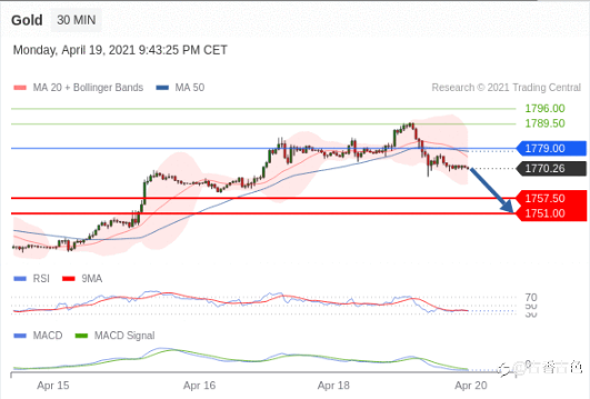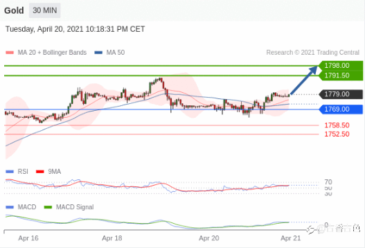 备选策略: 向上突破 1779 ,将带来继续上行的趋势,目标位定在 1789.50 和 1796 。