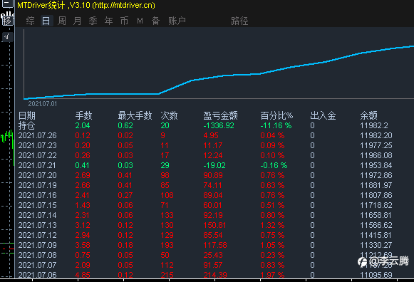 信号账户最近又增加了黄金,具体参数配置还是比较稳健的。目前收益快20%了,7月份最大回撤仅为400多美金,回撤仅为0.4%。稳健的基础上收益依旧给力。主要要回避澳,加,镑等近期波动巨大的货币对哦,毕竟全能EA是震荡型EA也不喜欢单边,虽然不怕 风险提示:本文所述仅代表作者个人观点,不代表 Followme 的官方立场。Followme 不对内容的准确性、完整性或可靠性作出任何保证,对于基于该内容所采取的任何行为,不承担任何责任,除非另有书面明确说明。