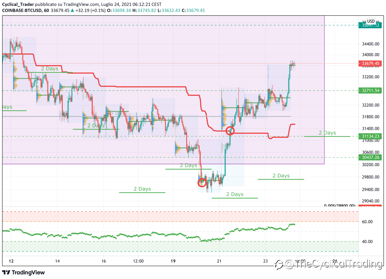 Sull’intraday sta spingendo forte e il livello del CSL è a quota 57%, il prezzo potrebbe raggiungere in giornata la resistenza a 35000 per poi effettuare un pullback, ma questo lo analizzeremo più tardi, per adesso attendiamo l’eccesso di forza al 60%.