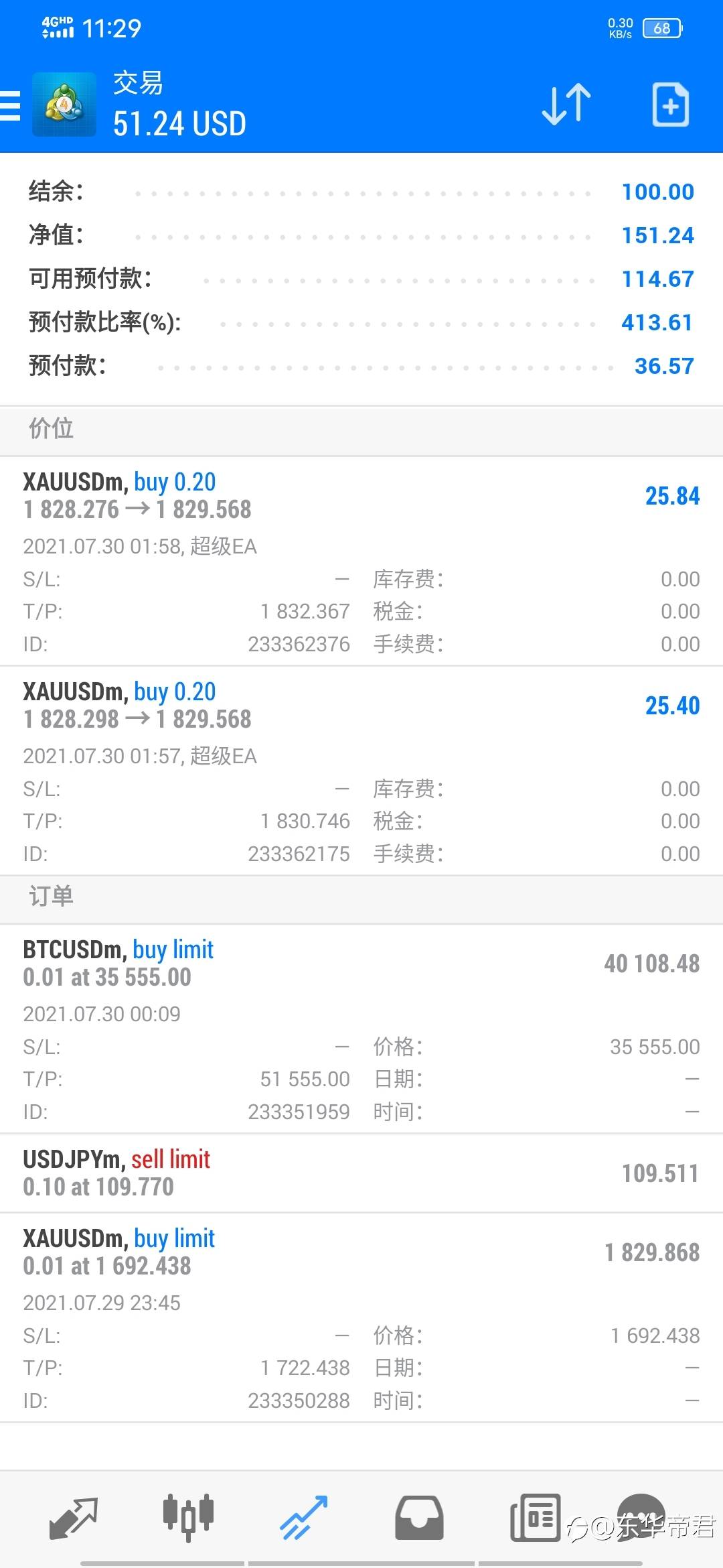 EA不能看,之前测试都无法无天了,这个又要被你们一顿狂暴。实盘是100$好几天才反一倍(风控必须在90%以上)。这个比特币手续费和浮动点差高,不好把控。 风险提示:本文所述仅代表作者个人观点,不代表 Followme 的官方立场。Followme 不对内容的准确性、完整性或可靠性作出任何保证,对于基于该内容所采取的任何行为,不承担任何责任,除非另有书面明确说明。