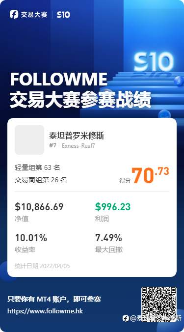 开赛第二天,前进了几名! 风险提示:本文所述仅代表作者个人观点,不代表 Followme 的官方立场。Followme 不对内容的准确性、完整性或可靠性作出任何保证,对于基于该内容所采取的任何行为,不承担任何责任,除非另有书面明确说明。