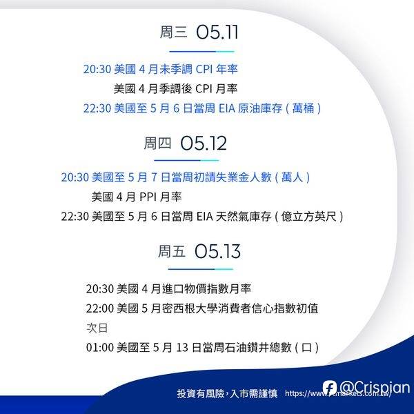 #一周重要財經數據與事件 緊跟市場趨勢 市場風雲變幻難預測 提前獲知重要數據 投資決策更精準 本週5月9日-5月13日,我們需要關注什麼? 风险提示:本文所述仅代表作者个人观点,不代表 Followme 的官方立场。Followme 不对内容的准确性、完整性或可靠性作出任何保证,对于基于该内容所采取的任何行为,不承担任何责任,除非另有书面明确说明。