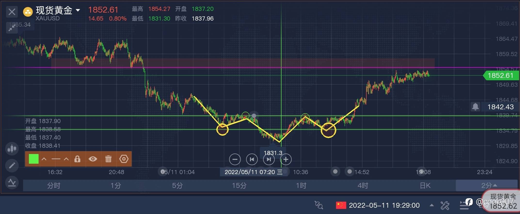 当前行情形态分析: 经典形态:头肩底,当走出这个形态,激进者一般在右肩位置入场,止损比前面低点低一些。稳健者,则等待打破颈部线入场,止损则在右肩位置。目标线,看前面的趋势的低点。当前是1850区域,为昨日前面一个趋势波段底部,这里则是一个目标位。短时间内的压力位。 风险提示:本文所述仅代表作者个人观点,不代表 Followme 的官方立场。Followme 不对内容的准确性、完整性或可靠性作出任何保证,对于基于该内容所采取的任何行为,不承担任何责任,除非另有书面明确说明。