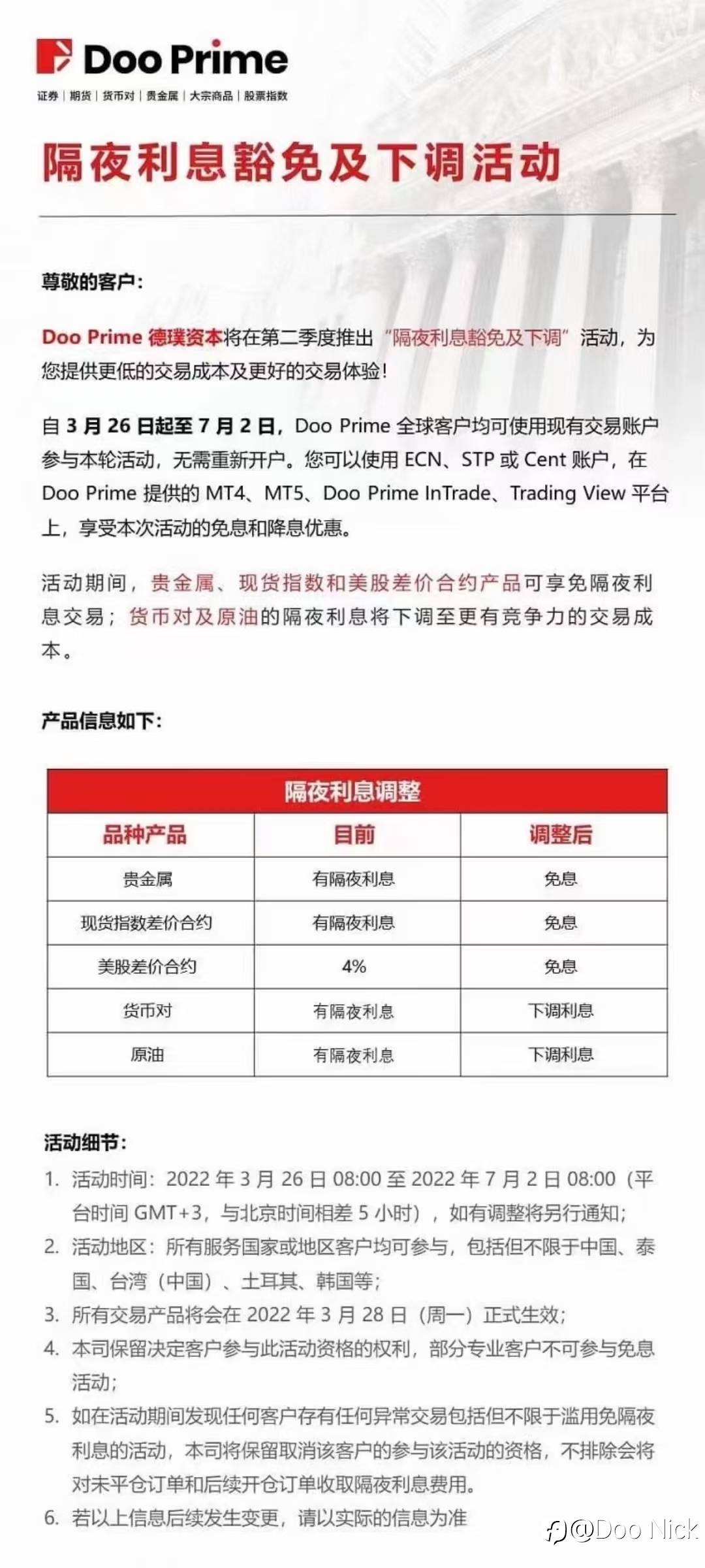 免息活动继续,继贵金属、现货指数和美股免息后,新增主要货币对免息,有兴趣的可以了解详情 风险提示:本文所述仅代表作者个人观点,不代表 Followme 的官方立场。Followme 不对内容的准确性、完整性或可靠性作出任何保证,对于基于该内容所采取的任何行为,不承担任何责任,除非另有书面明确说明。