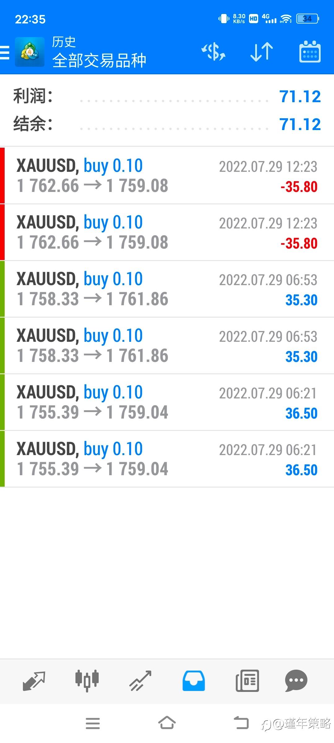 本人超短线模式ea,实盘账号可观摩,可免费跟 00:00:30 风险提示:本文所述仅代表作者个人观点,不代表 Followme 的官方立场。Followme 不对内容的准确性、完整性或可靠性作出任何保证,对于基于该内容所采取的任何行为,不承担任何责任,除非另有书面明确说明。 赞赏作者 喜欢的话,赞赏支持一下