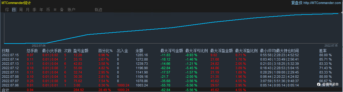 7月一晃就过了,2个账户表现还是挺满意,预期收益2个账户都达到了,2#账户大部分时间没有运行,收益也还不错,1#账户由于品种和波动率,所以很多时候会有一定的浮亏,账户情况看图就好,浮亏,持仓时间都有,总的来说月500USD的利润还是很满意!8月保持这个状态就好,欢迎各位投资朋友继续关注(图1为1#)(图2为2#)